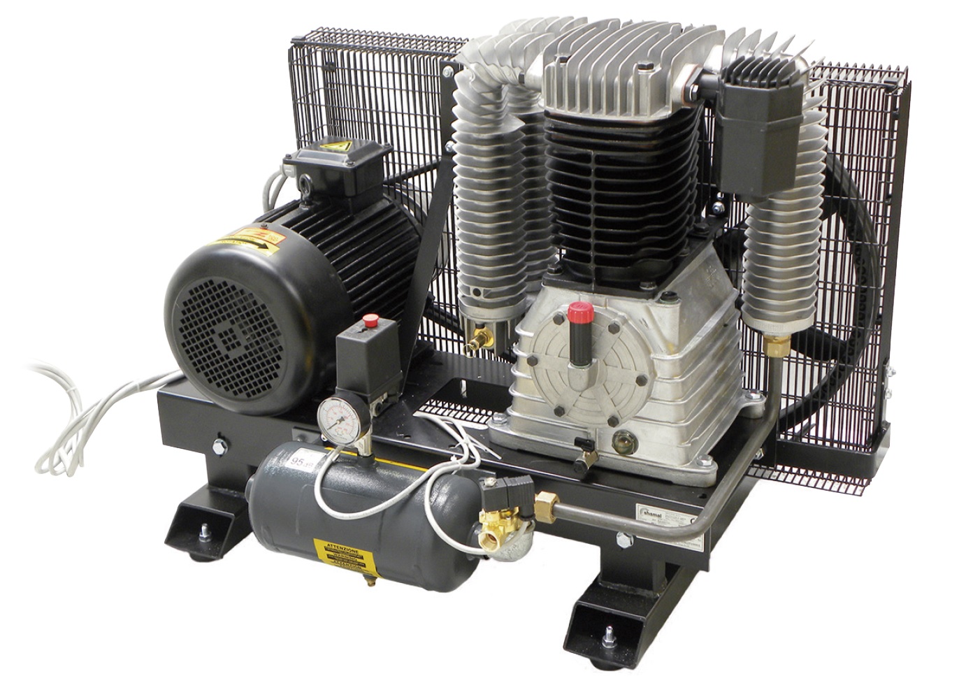 Compresor compacto en bancada, base al suelo, se suministra completamente equipada, con presostato, protección térmica, manómetro y válvula de retención.