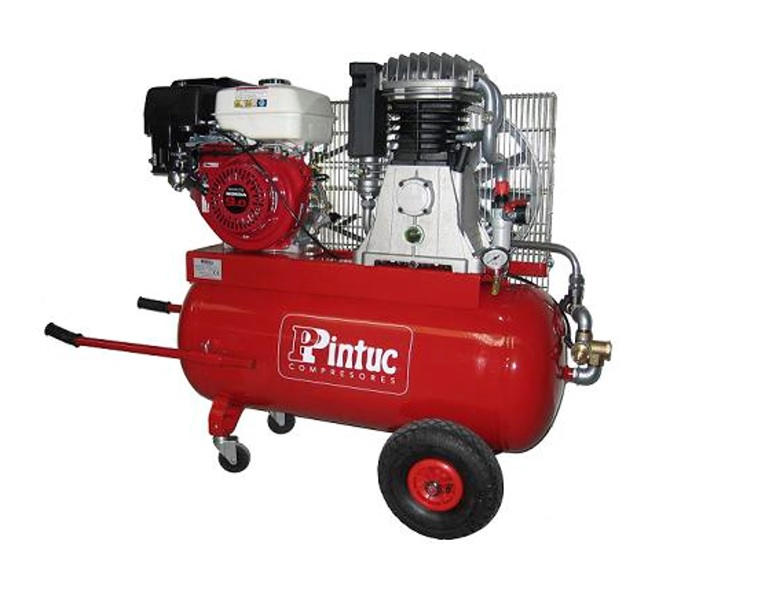 Compresor de pistón a gasolina con cabezal de aluminio, cilindro de fundición y a transmisión por correa. Funcionamiento marcha en vacío. Incluye filtro regulador en salida de aire y arranque manual.